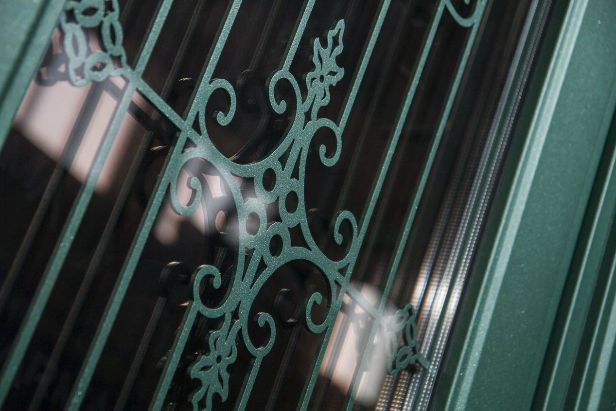 GRAFF - входная дверь выполнена в благородном тёмно-зелёном цвете, сочетает в себе строгость классики и изысканность деталей. Центральную часть украшает вертикальное стекло с художественной ковкой — изящные завитки и геометрические узоры придают изделию элегантность. Массивная рама с рельефными колоннами и декоративным карнизом подчёркивает солидность конструкции. Современная фурнитура гармонично вписана в дизайн, обеспечивая безопасность и удобство использования.