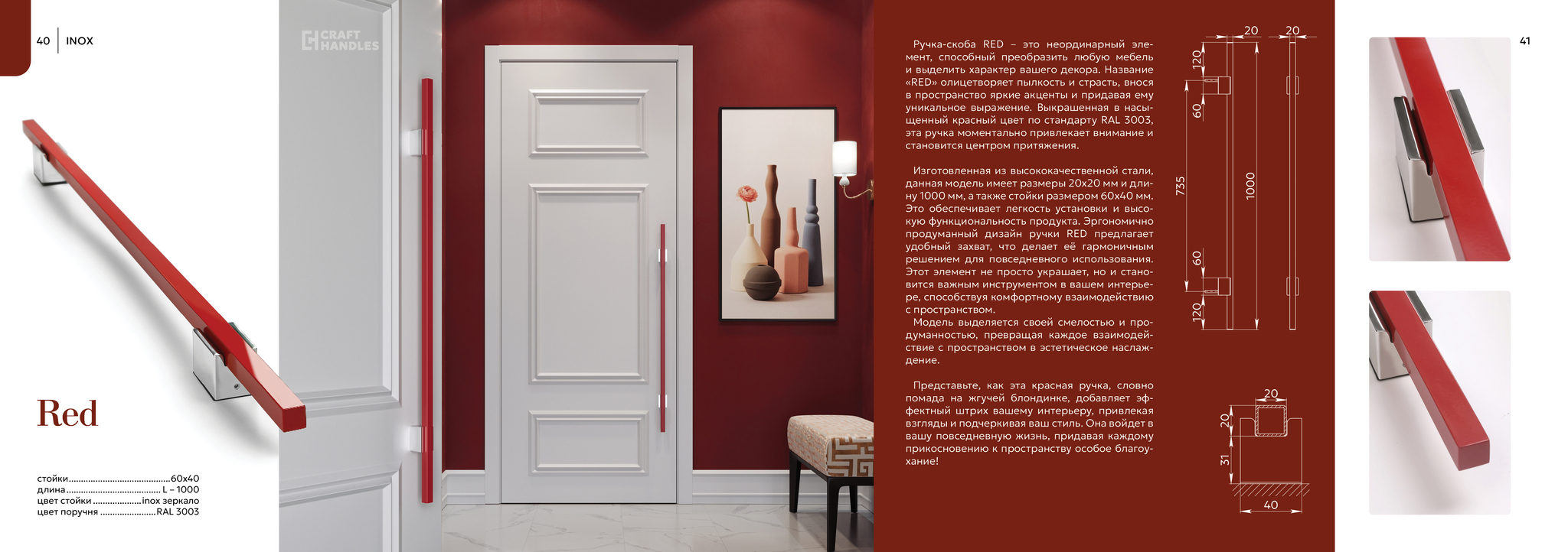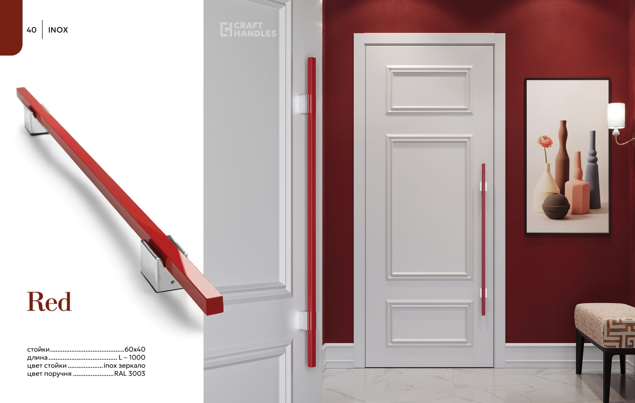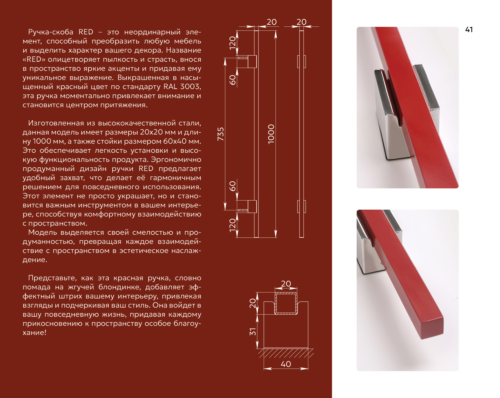 Ручка-скоба RED – это неординарный элемент, способный преобразить любую мебель и выделить характер вашего декора. Название "RED" олицетворяет пылкость и страсть, внося в пространство яркие акценты и придавая ему уникальное выражение. Выкрашенная в насыщенный красный цвет по стандарту RAL 3003, эта ручка моментально привлекает внимание и становится центром притяжения.