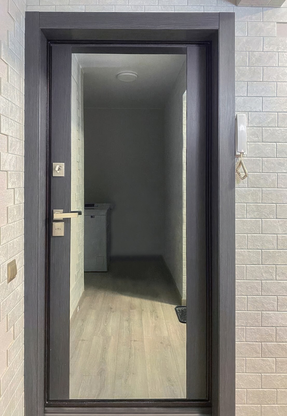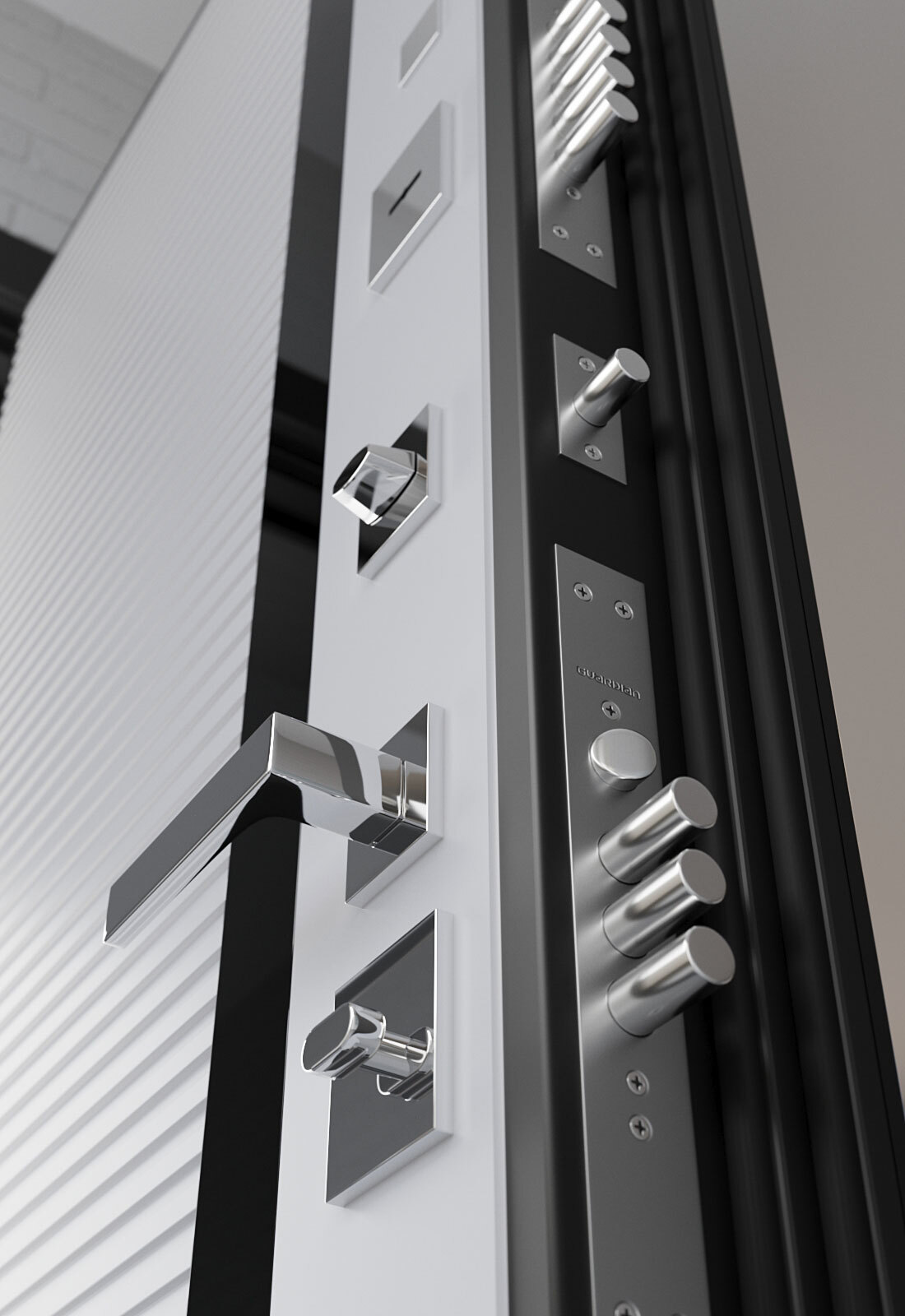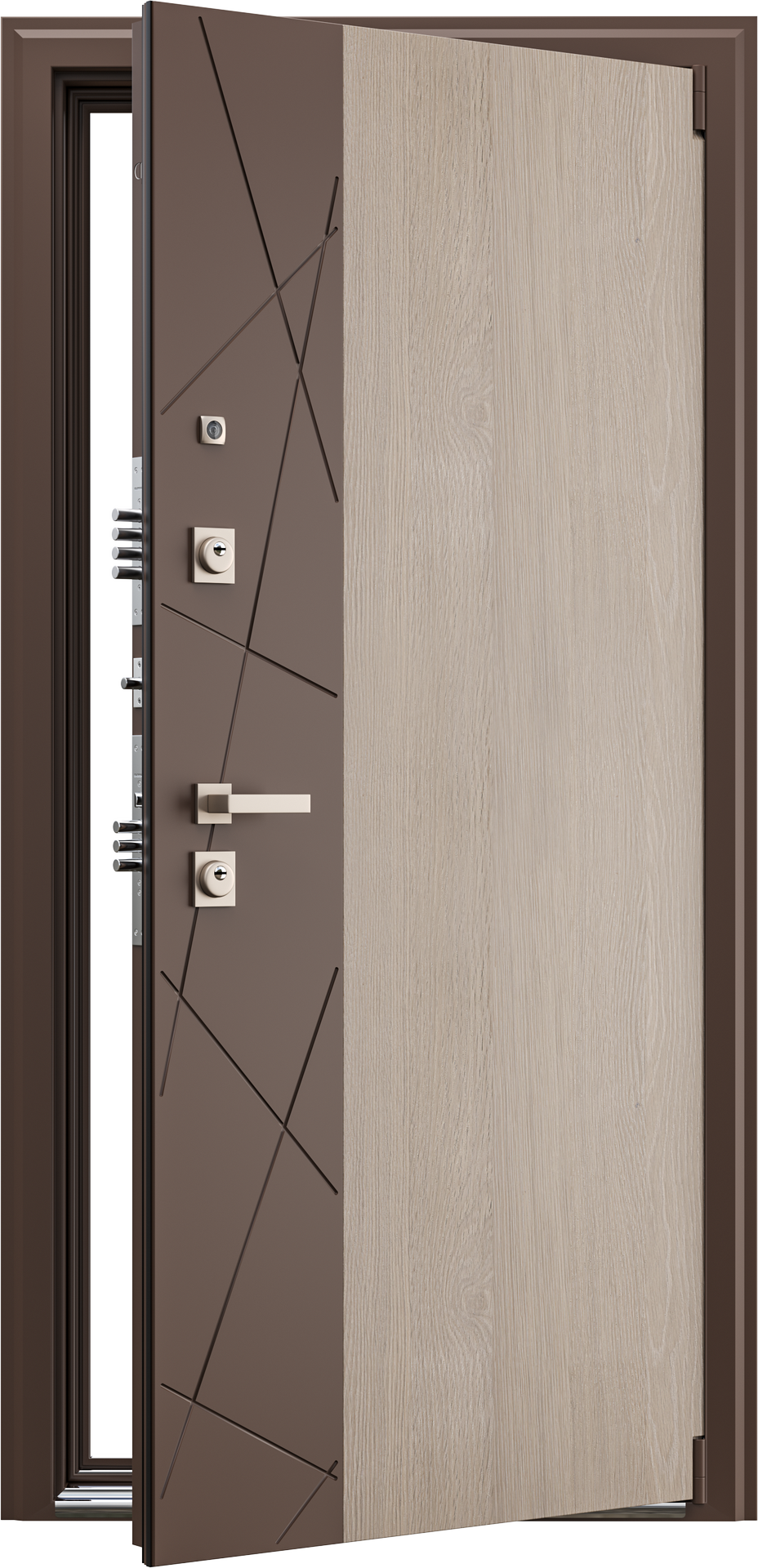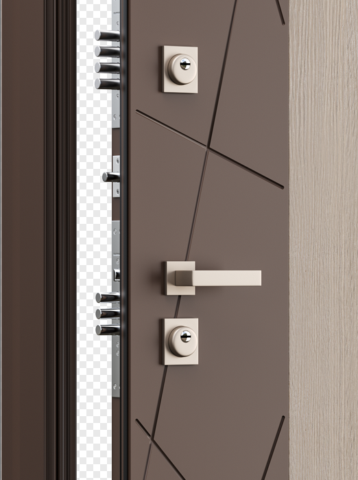 Лаконичная серебристая фурнитура и удобное расположение замков и ручки делают дверь практичной. Прочная металлическая конструкция с изысканной отделкой — идеальный выбор для тех, кто ценит безопасность и стиль.