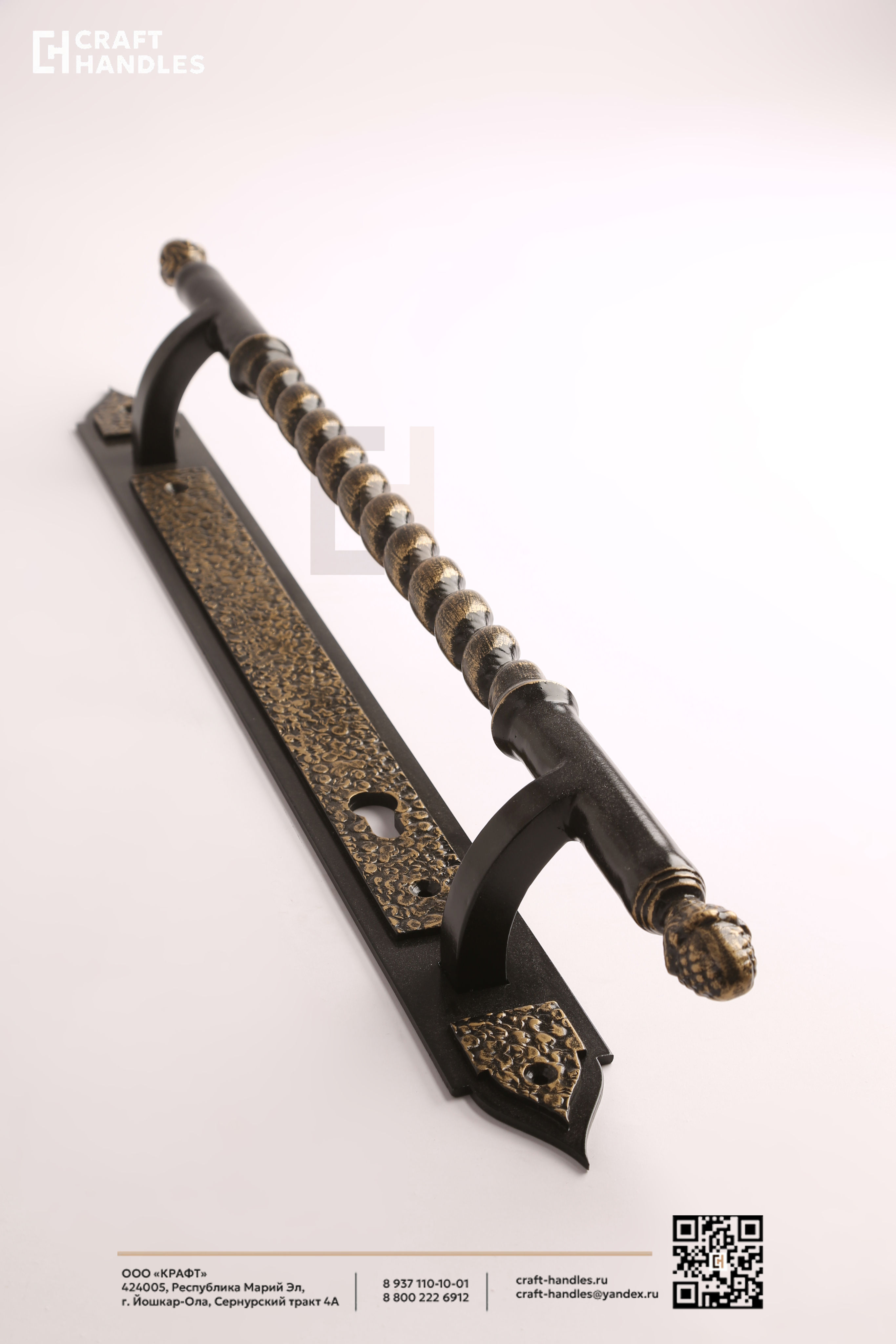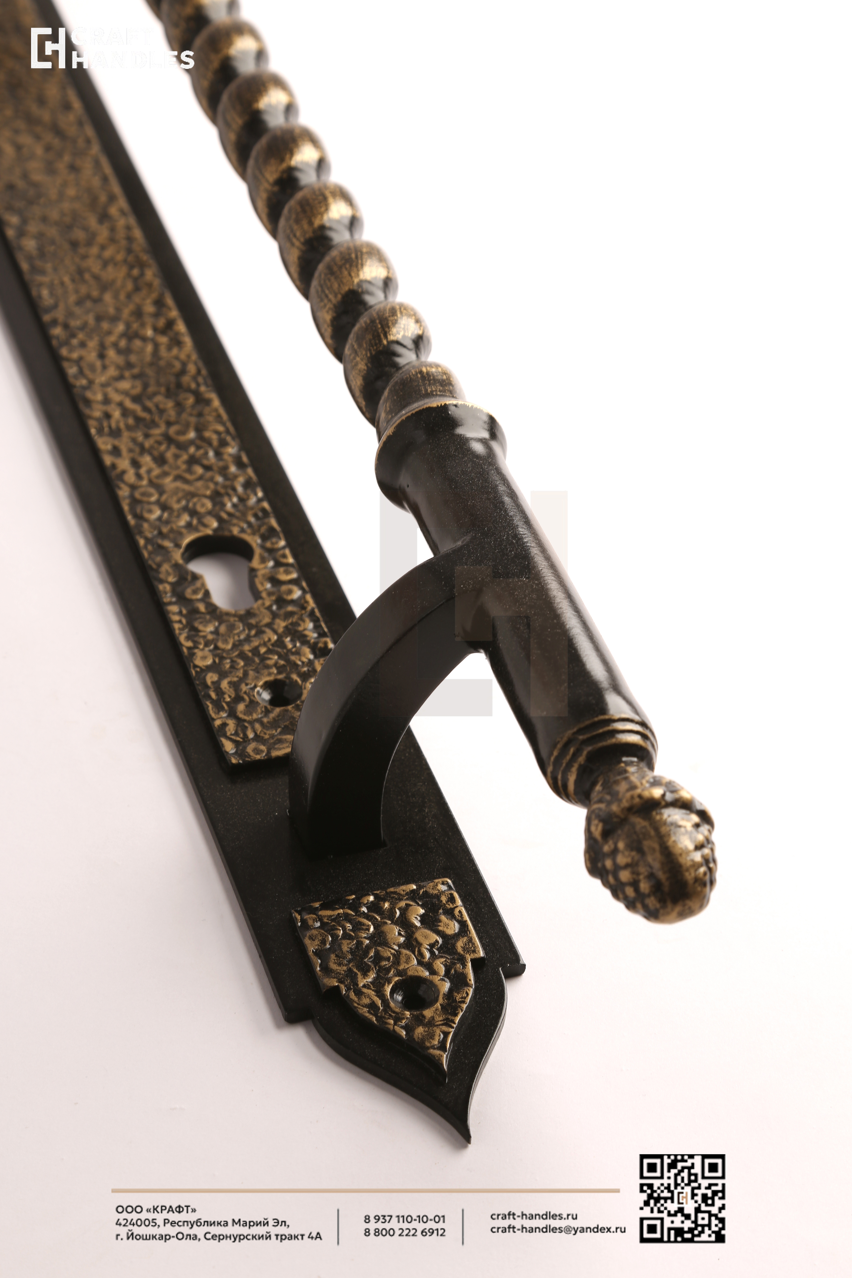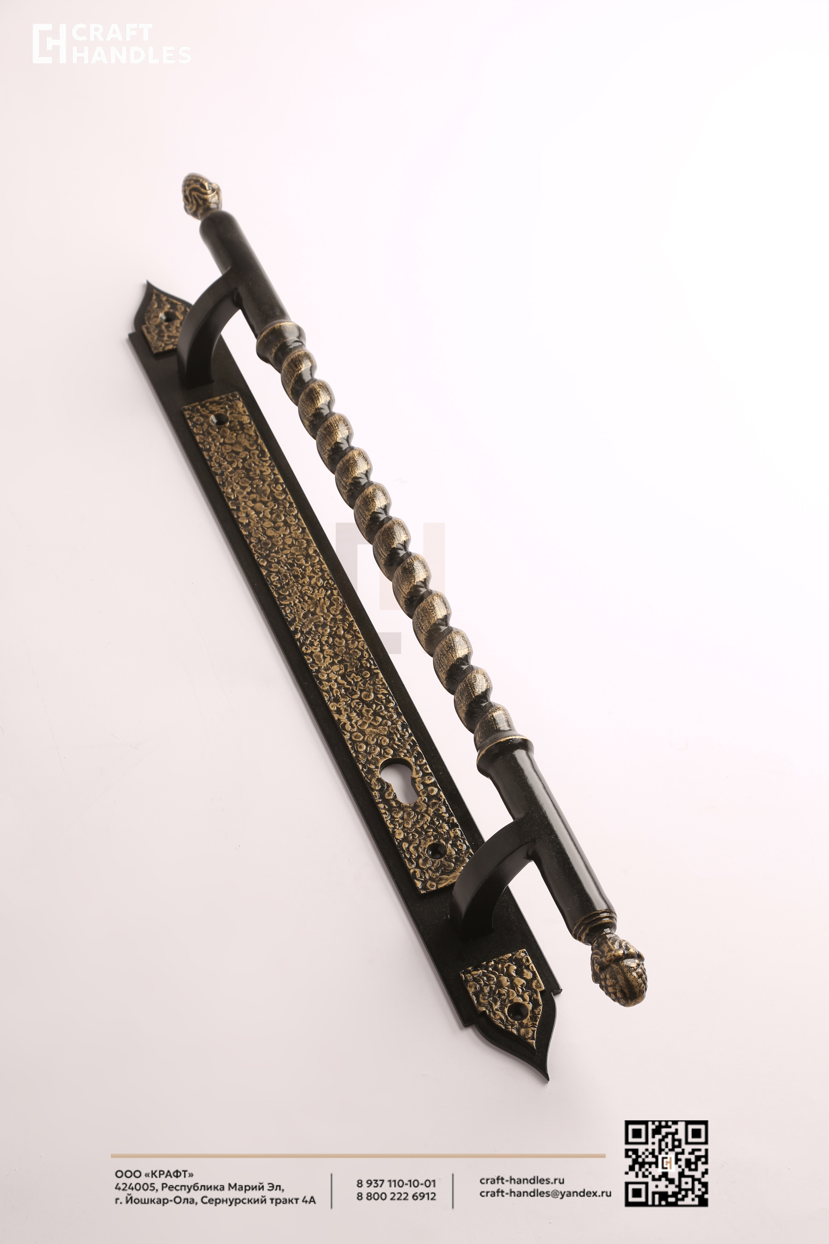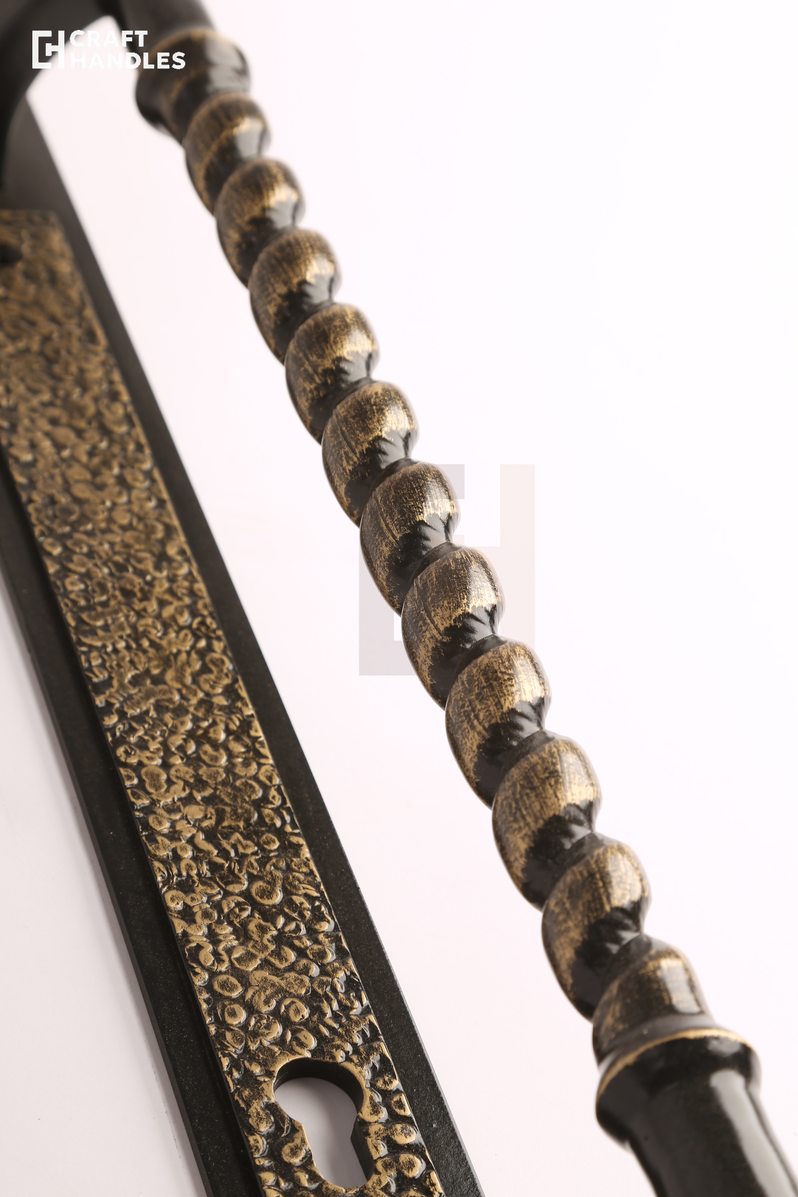 Кованая дверная ручка VERSAILLES (Версаль) — это классика дворцового стиля, выполненная настоящим мастером. Глубокий чёрный фон и благородная патинированная бронза создают дорогой, выверенный контраст, который сразу считывается как премиум. Витой стержень с бусинами закручивается в классическом ритме барокко — взгляд цепляется и не отпускает. Планка стрельчатая, с характерной кованой текстурой, которая выдаёт ручную работу. Навершие в виде классического декоративного шара завершает композицию аккуратно и солидно.